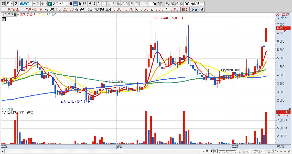 - 이구산업 (6,790원 ▲ 19.12% , 시총: 2,271억, 거래량: 101,254,137, 거래대금:6,764억)