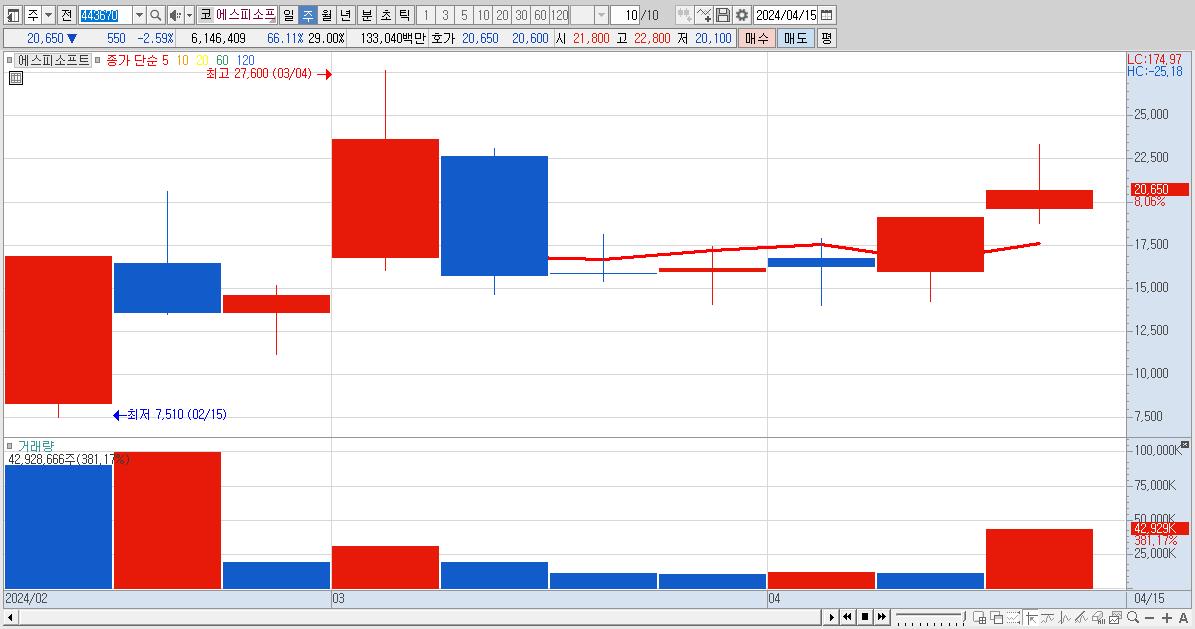 - 에스피소프트 (20,650원 ▲ 8.06% , 시총: 4,377억, 거래량: 42,928,666, 거래대금:8,988억)