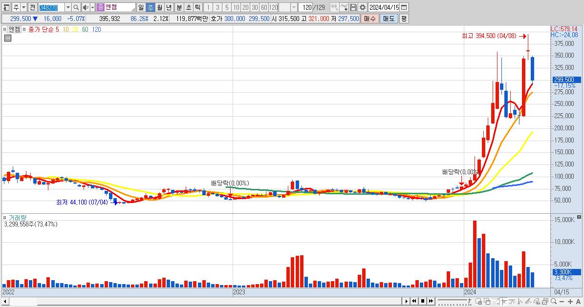 - 엔켐 (299,500원 ▼ -17.15% , 시총: 55,989억, 거래량: 3,299,558, 거래대금:10,559억)