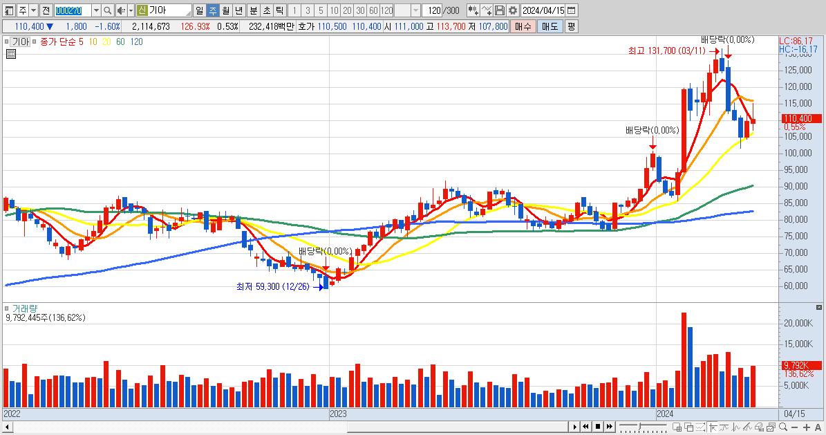 - 기아 (110,400원 ▲ 0.55% , 시총: 443,857억, 거래량: 9,792,445, 거래대금:10,999억)