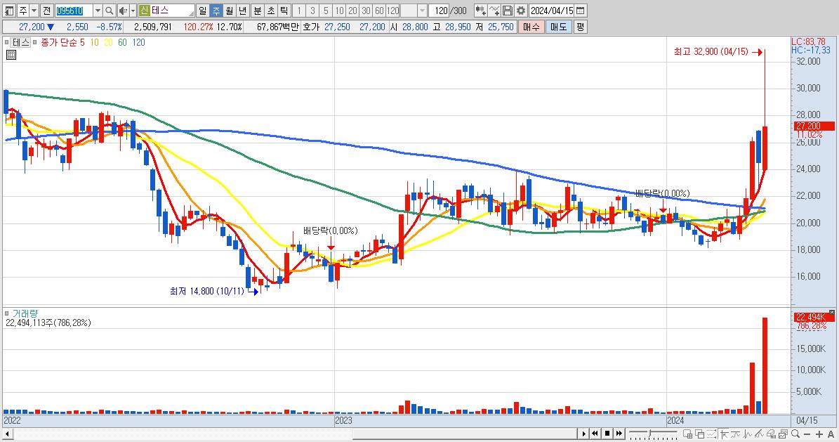 - 테스 (27,200원 ▲ 11.02% , 시총: 5,377억, 거래량: 22,494,113, 거래대금:6,479억)