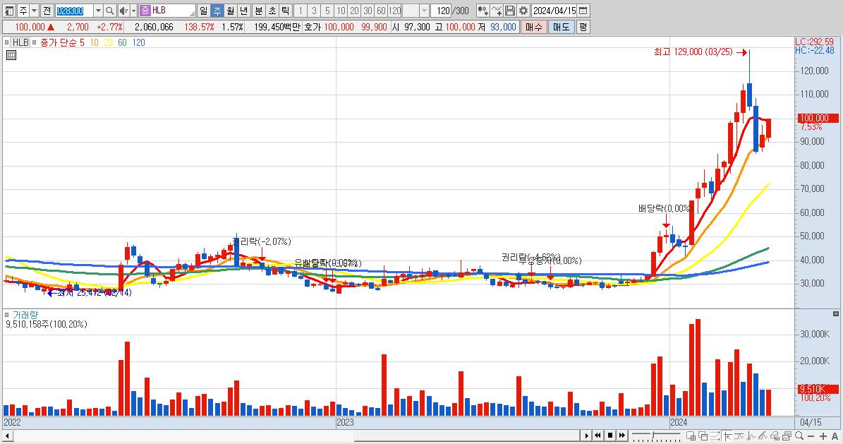 - HLB (100,000원 ▲ 7.53% , 시총: 130,830억, 거래량: 9,510,158, 거래대금:9,103억)