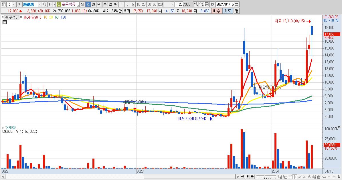 - 흥구석유 (17,050원 ▲ 9.65% , 시총: 2,558억, 거래량: 59,635,172, 거래대금:10,193억)
