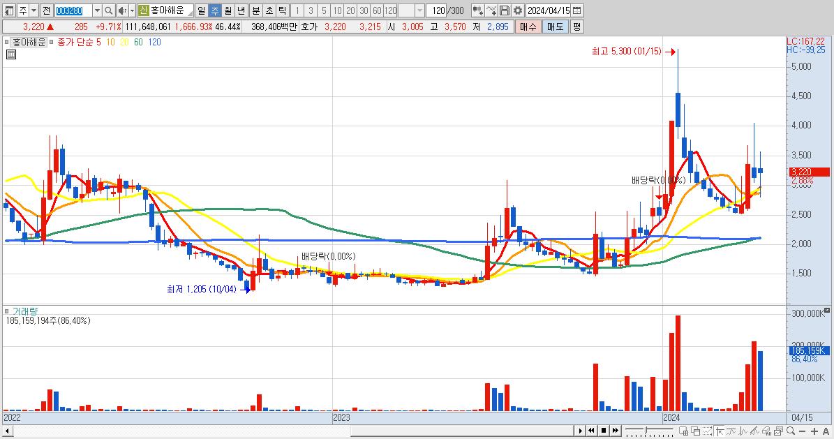 - 흥아해운 (3,220원 ▲ 2.88% , 시총: 7,742억, 거래량: 185,159,194, 거래대금:5,959억)