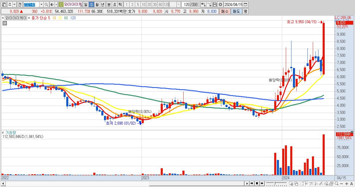 - 와이아이케이 (9,820원 ▲ 53.2% , 시총: 8,057억, 거래량: 112,583,846, 거래대금:10,087억)