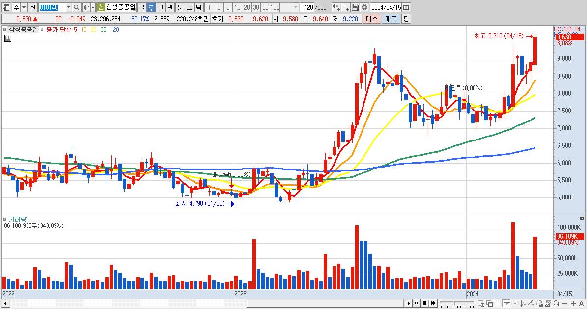 - 삼성중공업 (9,630원 ▲ 8.08% , 시총: 84,744억, 거래량: 86,188,932, 거래대금:7,970억)