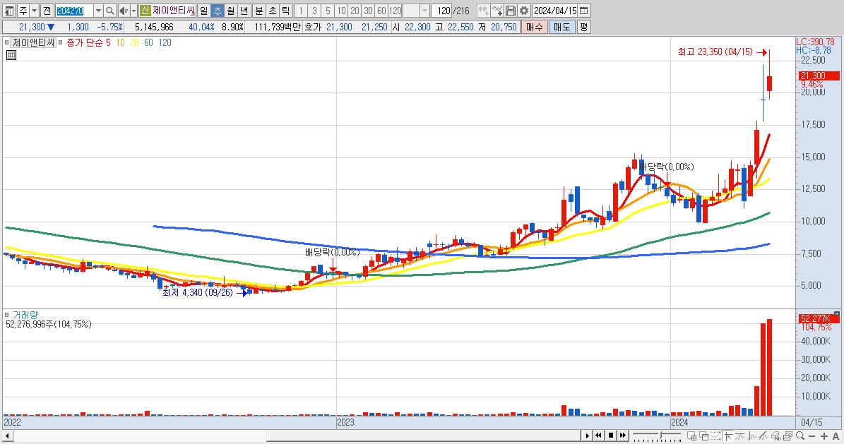 - 제이앤티씨 (21,300원 ▲ 9.46% , 시총: 12,322억, 거래량: 52,276,996, 거래대금:11,283억)