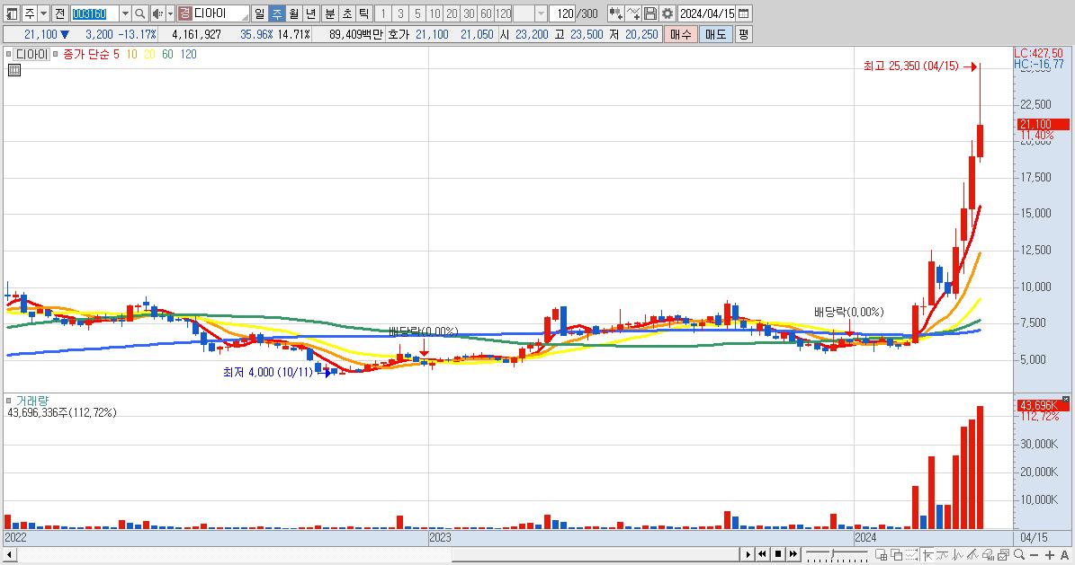 - 디아이 (21,100원 ▲ 11.4% , 시총: 5,971억, 거래량: 43,696,336, 거래대금:9,419억)