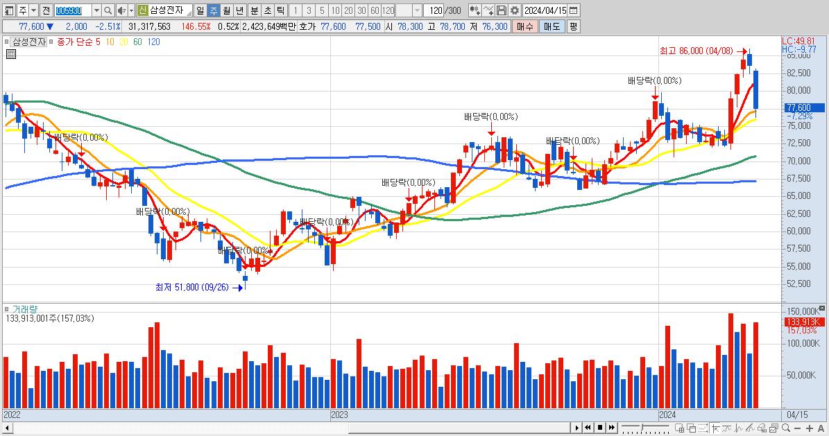 - 삼성전자 (77,600원 ▼ -7.29% , 시총: 4,632,551억, 거래량: 133,913,001, 거래대금:106,707억)