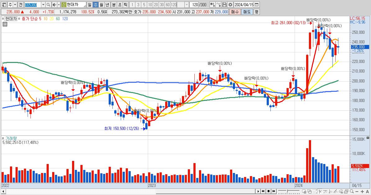 - 현대차 (235,000원 ▼ -1.26% , 시총: 492,128억, 거래량: 5,592,251, 거래대금:13,214억)