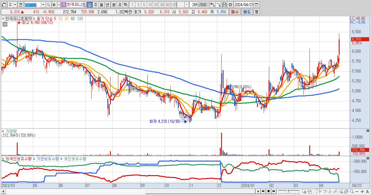 - 한국유니온제약 (6,310원 ▲ 6.95% , 시총: 499억, 거래량: 212,764, 거래대금:13억, KOSDAQ)
