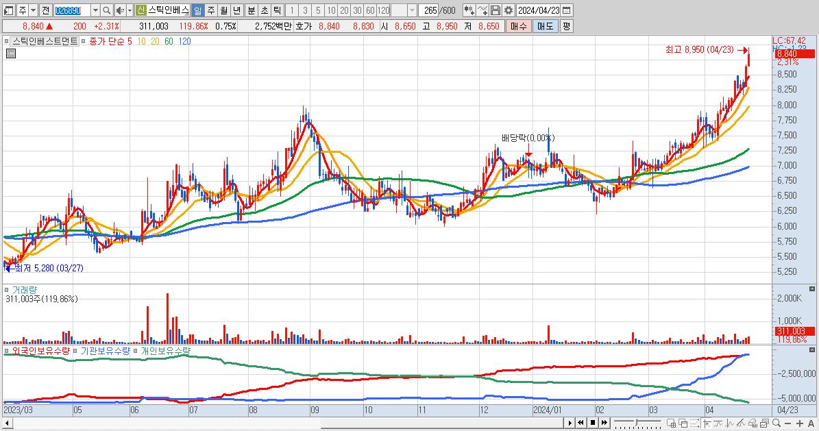 - 스틱인베스트먼트 (8,840원 ▲ 2.31% , 시총: 3,684억, 거래량: 311,003, 거래대금:28억, KOSPI)