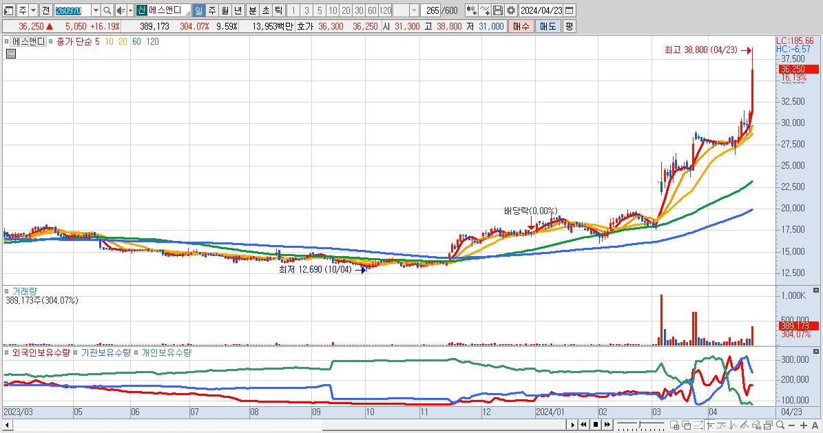 - 에스앤디 (36,250원 ▲ 16.19% , 시총: 1,472억, 거래량: 389,173, 거래대금:140억, KOSDAQ)