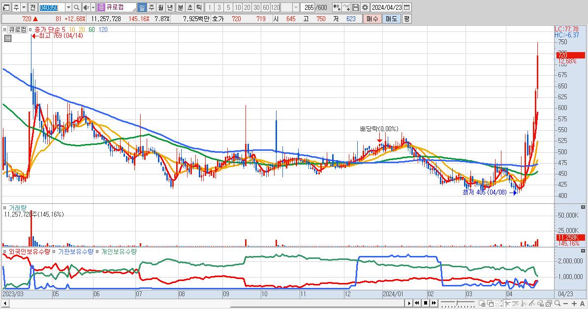 - 큐로컴 (720원 ▲ 12.68% , 시총: 1,029억, 거래량: 11,257,728, 거래대금:79억, KOSDAQ)