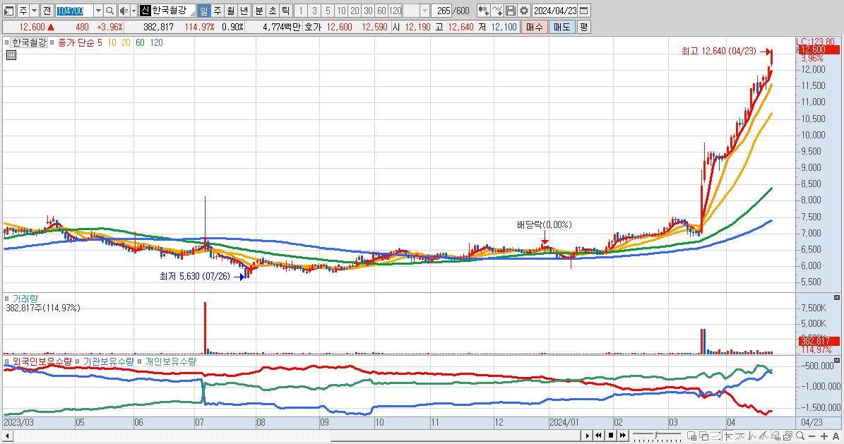 한국철강 12,600원 ▲ 3.96% (KOSPI, 104700)