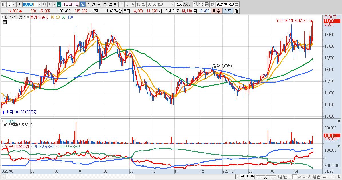 - 대양전기공업 (14,080원 ▲ 5% , 시총: 1,347억, 거래량: 100,335, 거래대금:14억, KOSDAQ)