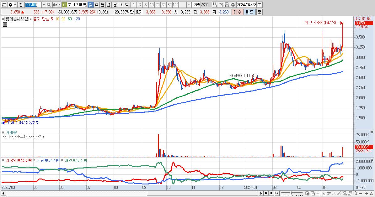 롯데손해보험 3,850원 ▲ 17.92% (KOSPI, 000400)