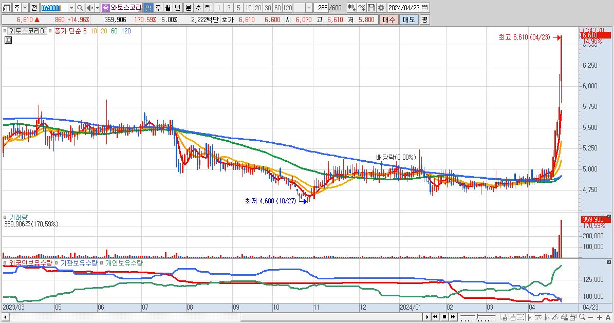 - 와토스코리아 (6,610원 ▲ 14.96% , 시총: 476억, 거래량: 359,906, 거래대금:22억, KOSDAQ)