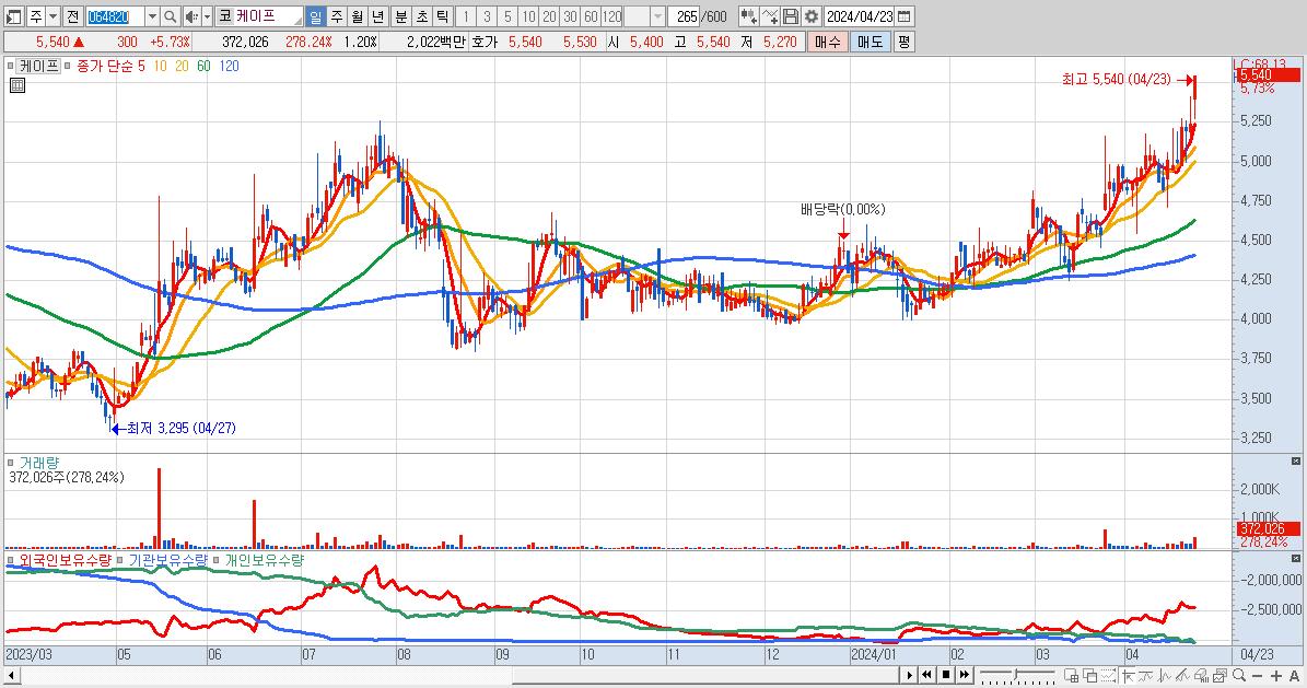 - 케이프 (5,540원 ▲ 5.73% , 시총: 1,712억, 거래량: 372,026, 거래대금:20억, KOSDAQ)
