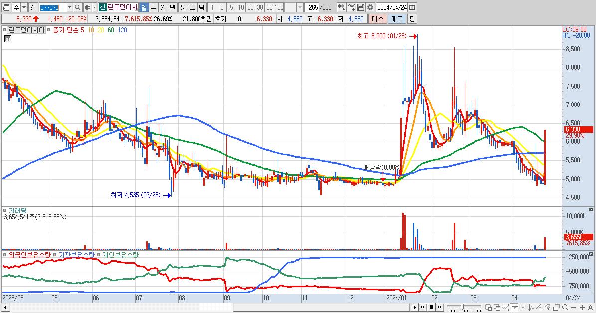 - 린드먼아시아 (6,330원 ▲ 29.98% , 시총: 867억, 거래량: 3,654,541, 거래대금:218억)