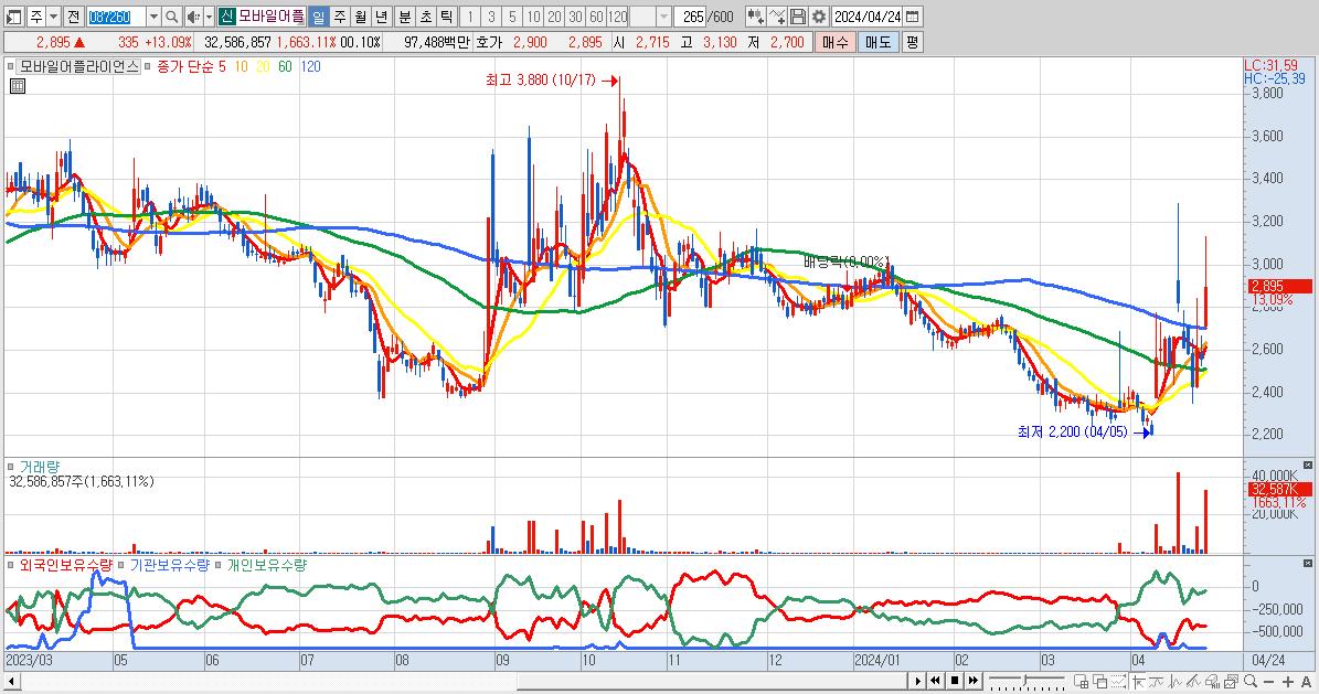 - 모바일어플라이언스 (2,895원 ▲ 13.09% , 시총: 942억, 거래량: 32,586,857, 거래대금:975억)