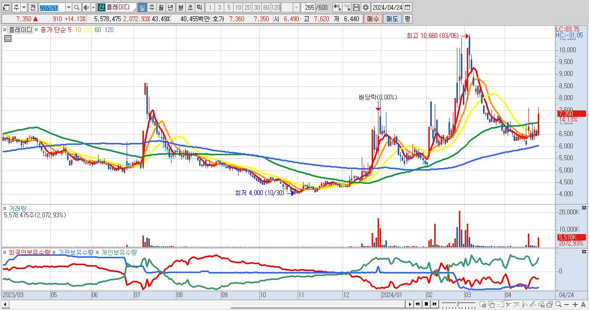 - 플레이디 (7,350원 ▲ 14.13% , 시총: 943억, 거래량: 5,578,475, 거래대금:405억)