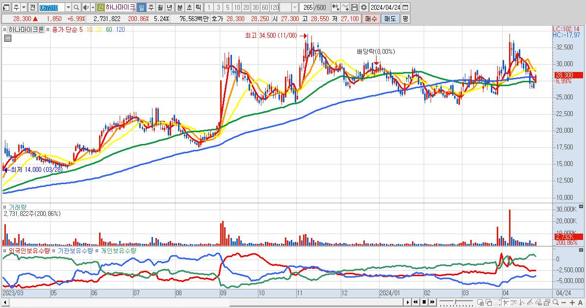 - 하나마이크론 (28,300원 ▲ 6.99% , 시총: 14,755억, 외국인 순매수 거래금:88억)