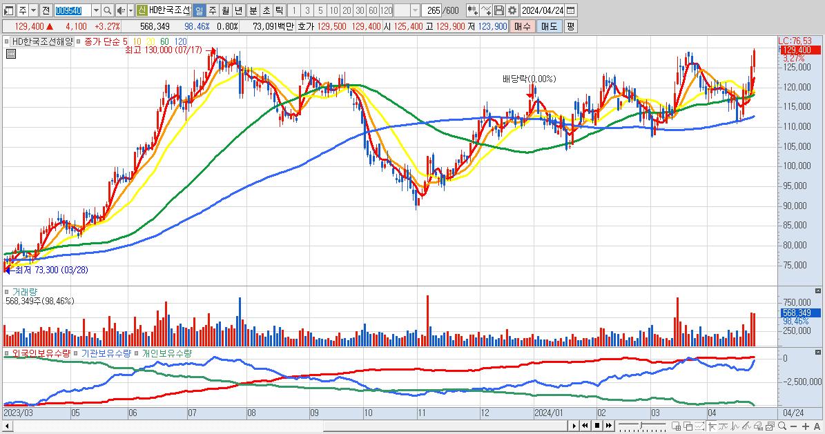- HD한국조선해양 (129,400원 ▲ 3.27% , 시총: 91,580억, 외국인 순매수 거래금:116억)