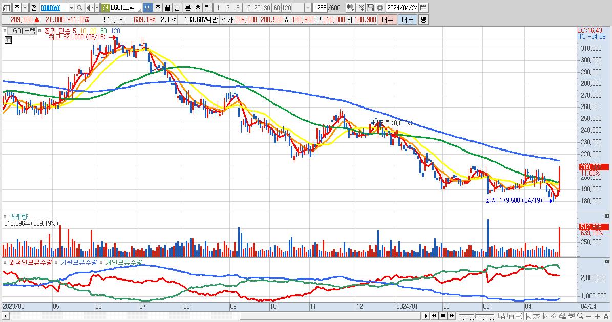 - LG이노텍 (209,000원 ▲ 11.65% , 시총: 49,464억, 외국인 순매수 거래금:255억)