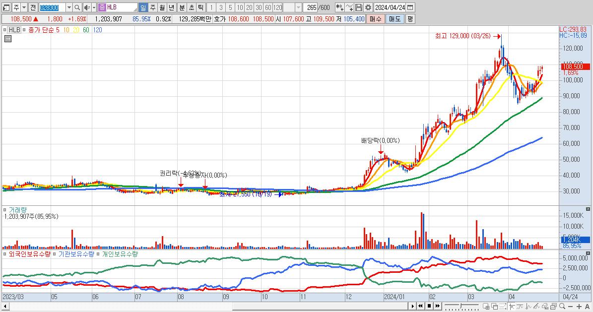 - HLB (108,500원 ▲ 1.69% , 시총: 141,951억, 외국인 순매수 거래금:99억)