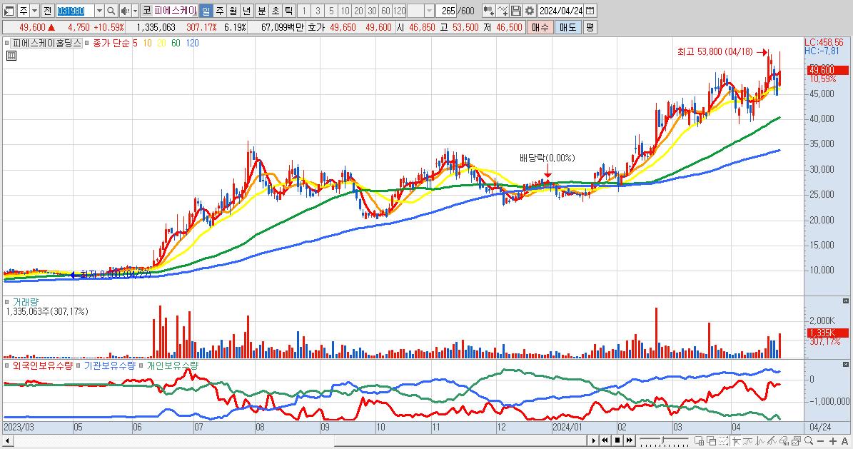 - 피에스케이홀딩스 (49,600원 ▲ 10.59% , 시총: 10,695억, 외국인 순매수 거래금:85억)