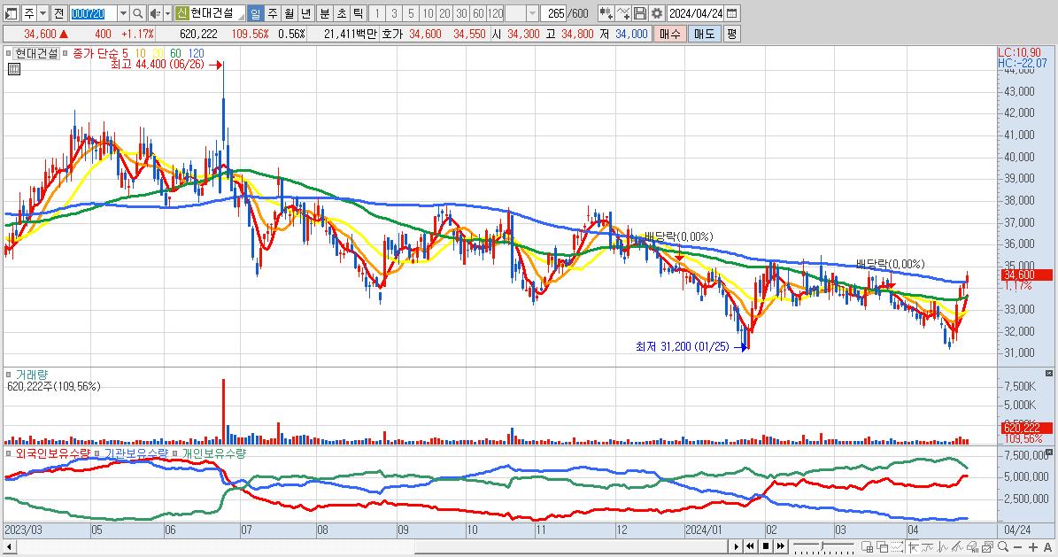 - 현대건설 (34,600원 ▲ 1.17% , 시총: 38,529억, 외국인 순매수 거래금:95억)