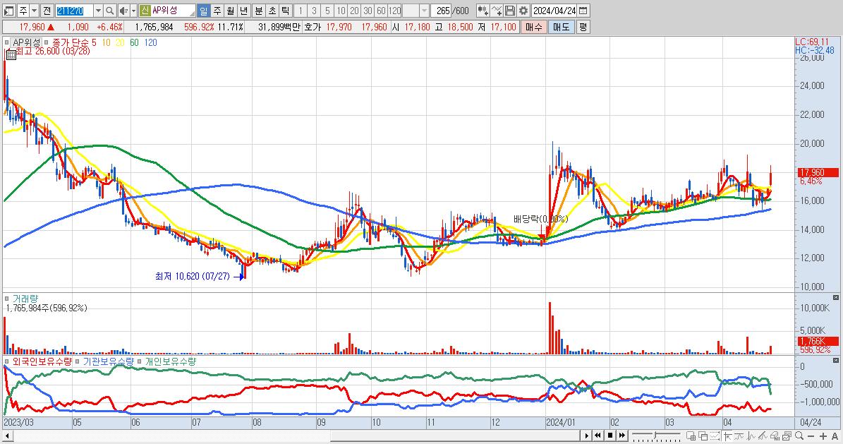 - AP위성 (17,960원 ▲ 6.46% , 시총: 2,709억, 외국인 순매수 거래금:72억)