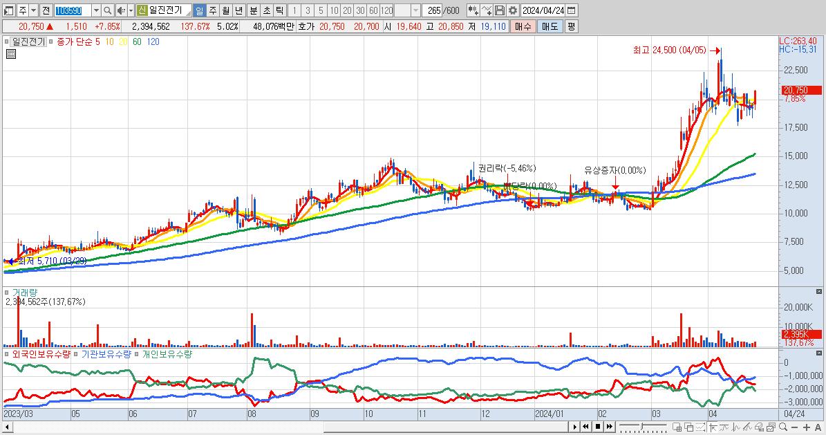 - 일진전기 (20,750원 ▲ 7.85% , 시총: 9,895억, 외국인 순매수 거래금:51억)