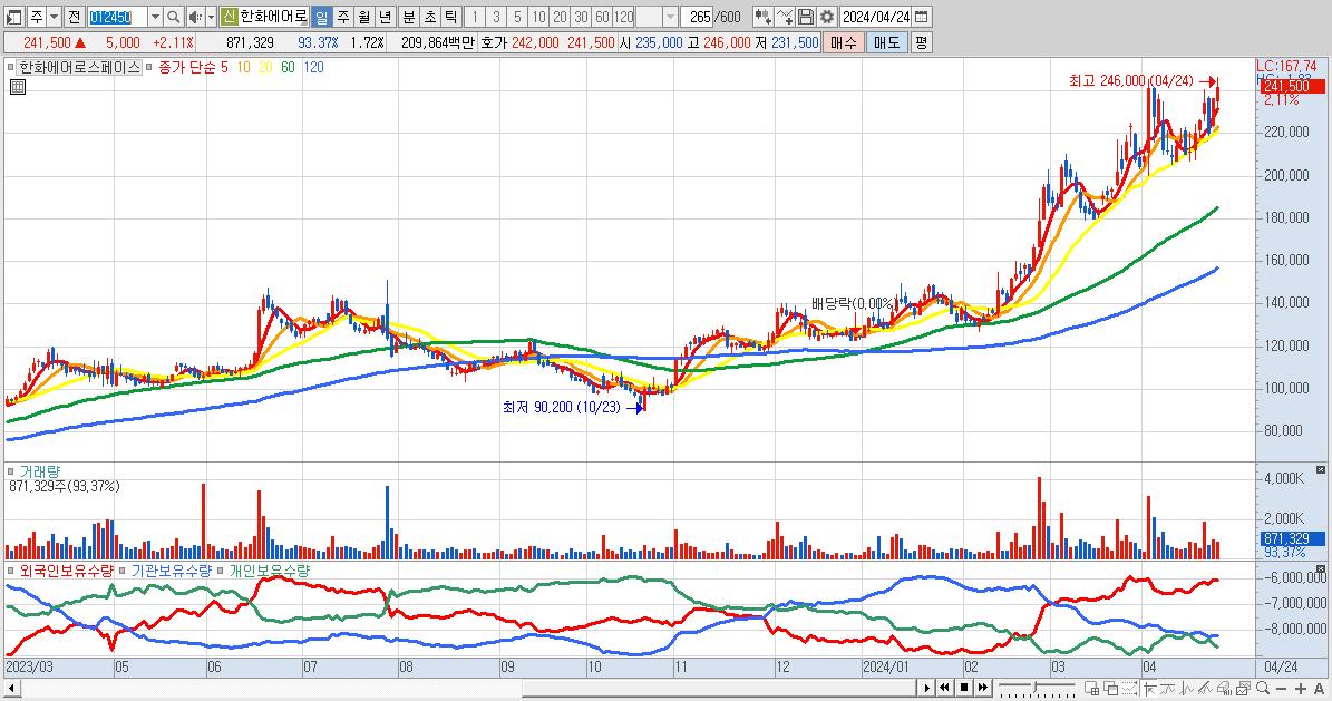 - 한화에어로스페이스 (241,500원 ▲ 2.11% , 시총: 122,271억, 외국인 순매수 거래금:210억)