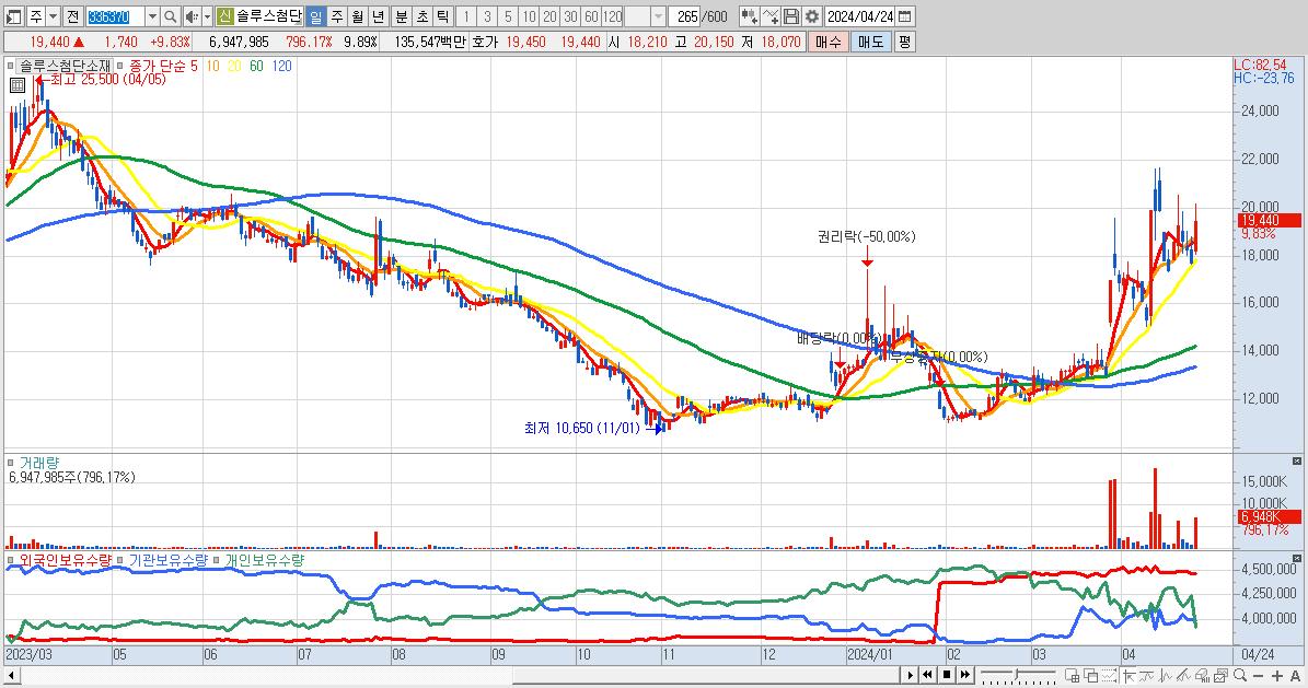 - 솔루스첨단소재 (19,440원 ▲ 9.83% , 시총: 13,650억, 외국인 순매수 거래금:60억)