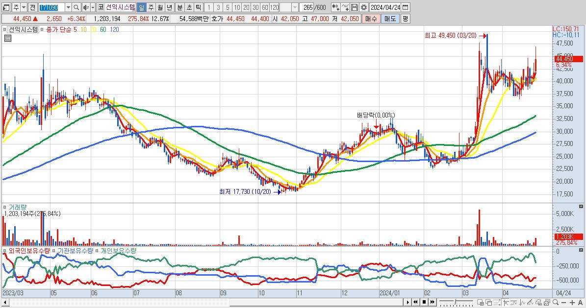 - 선익시스템 (44,450원 ▲ 6.34% , 시총: 4,220억, 외국인 순매수 거래금:47억)