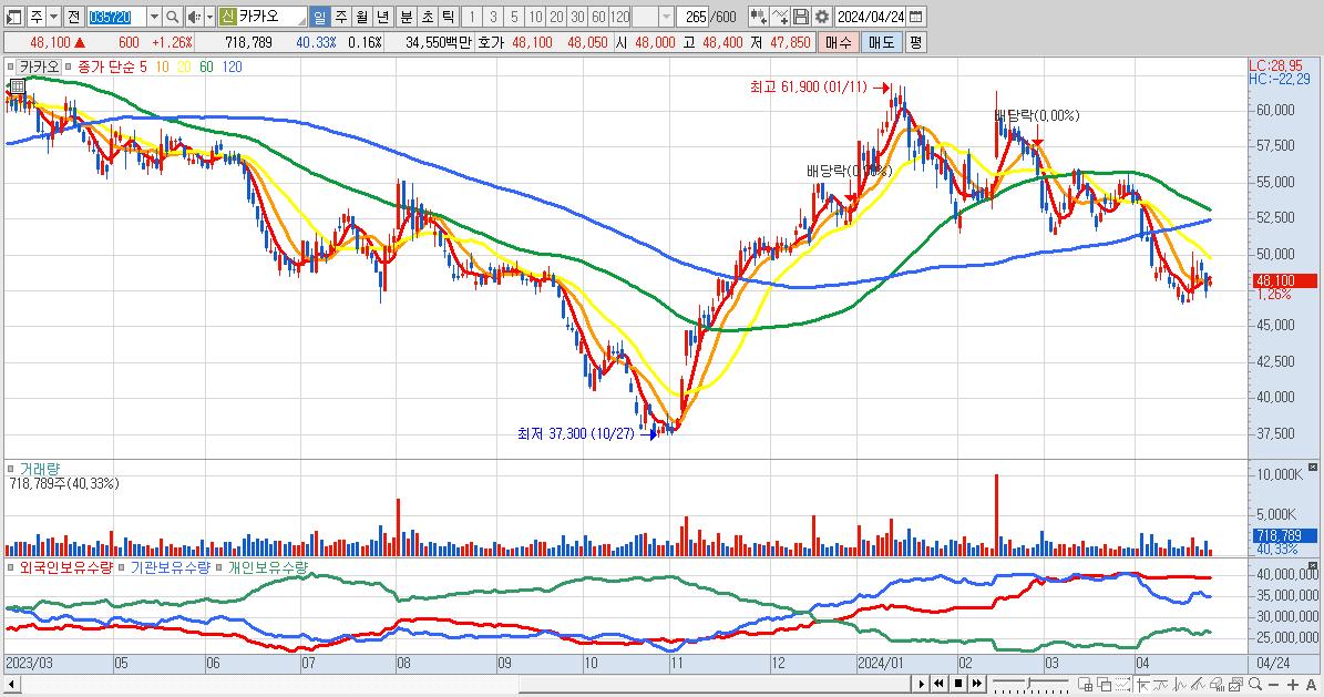 29.카카오 48,100원 ▲ 1.26% (KOSPI, 035720)