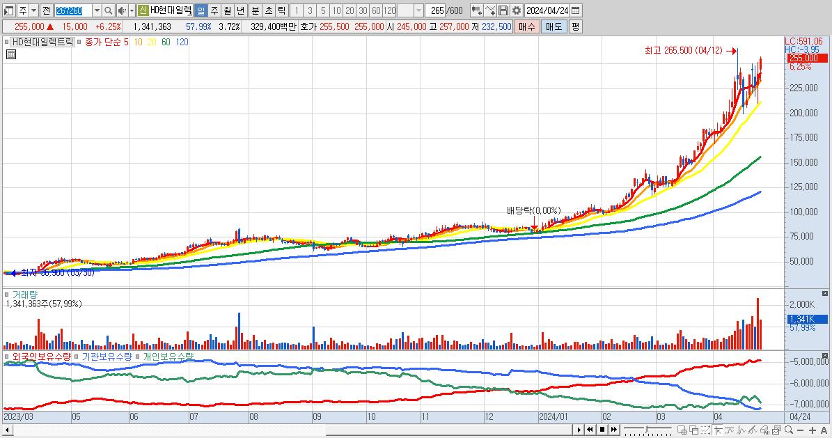 - HD현대일렉트릭 (255,000원 ▲ 6.25% , 시총: 91,920억, 외국인 순매수 거래금:439억)