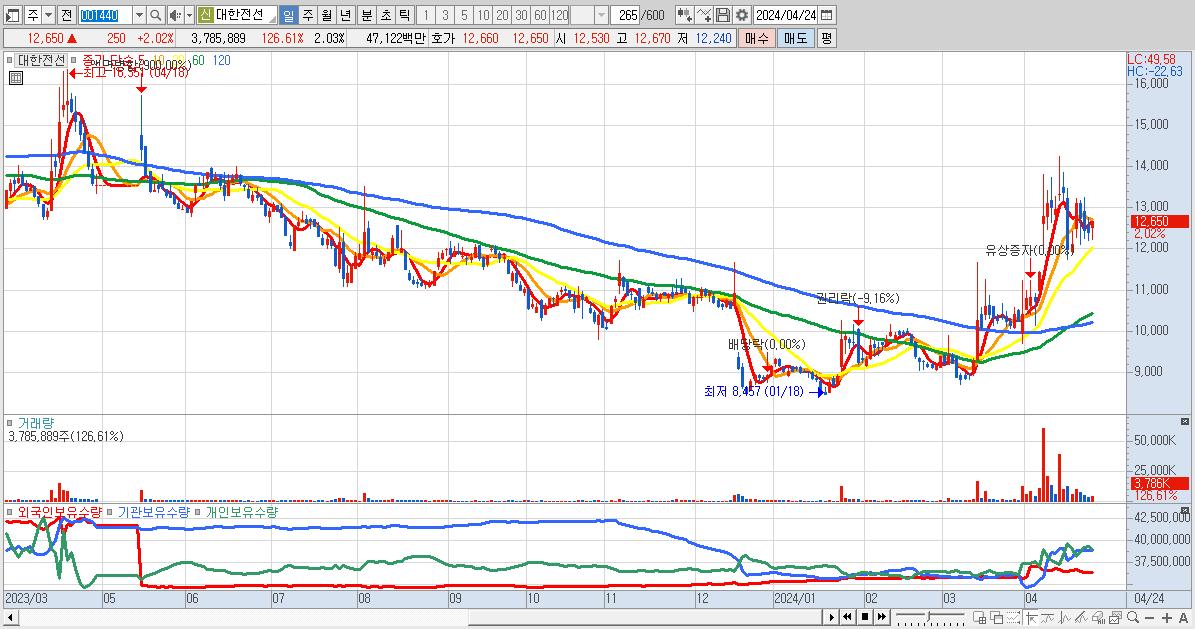 - 대한전선 (12,650원 ▲ 2.02% , 시총: 23,586억, 외국인 순매수 거래금:50억)