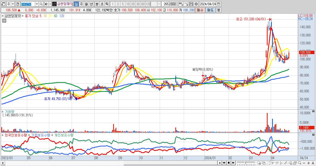 - 삼천당제약 (108,500원 ▲ 6.69% , 시총: 25,451억, 외국인 순매수 거래금:52억)