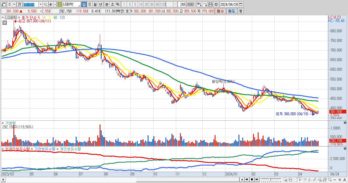- LG화학 (381,500원 ▲ 2.55% , 시총: 269,310억, 외국인 순매수 거래금:110억)