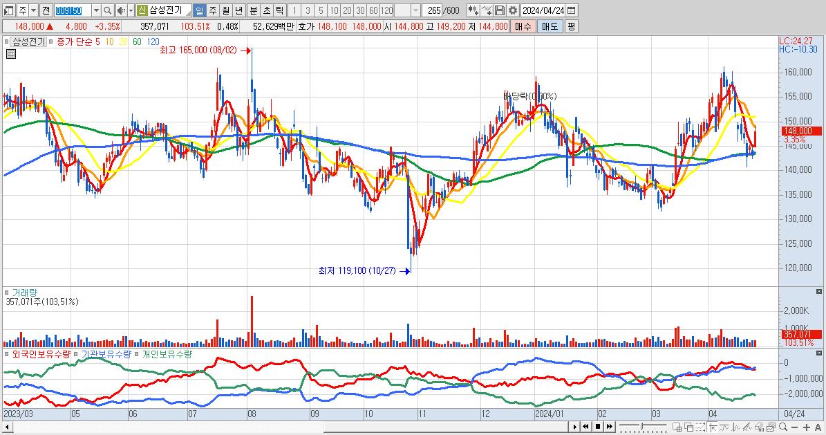 - 삼성전기 (148,000원 ▲ 3.35% , 시총: 110,547억, 외국인 순매수 거래금:53억)