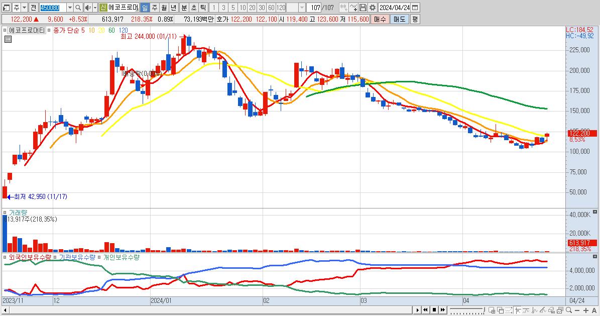 - 에코프로비엠 (245,500원 ▲ 5.14% , 시총: 240,102억, 외국인 순매수 거래금:61억)