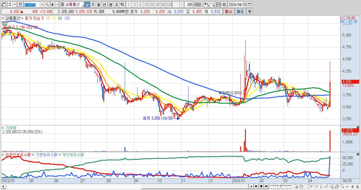 - 삼륭물산 (4,030원 ▲ 13.68% , 시총: 610억, 거래량: 2,326,682, 거래대금:98억)