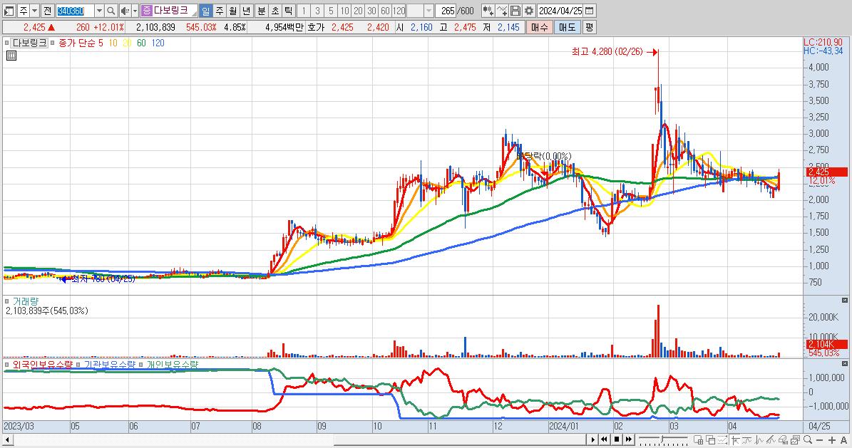 - 다보링크 (2,425원 ▲ 12.01% , 시총: 1,052억, 거래량: 2,103,839, 거래대금:50억)