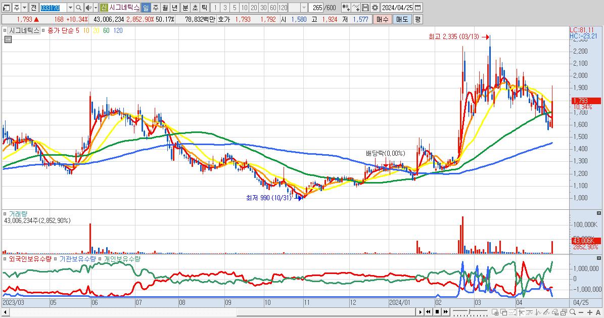 - 시그네틱스 (1,793원 ▲ 10.34% , 시총: 1,537억, 거래량: 43,006,234, 거래대금:788억)