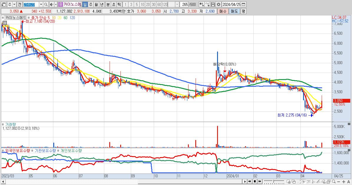 - 카이노스메드 (3,050원 ▲ 12.55% , 시총: 852억, 거래량: 1,127,082, 거래대금:35억)