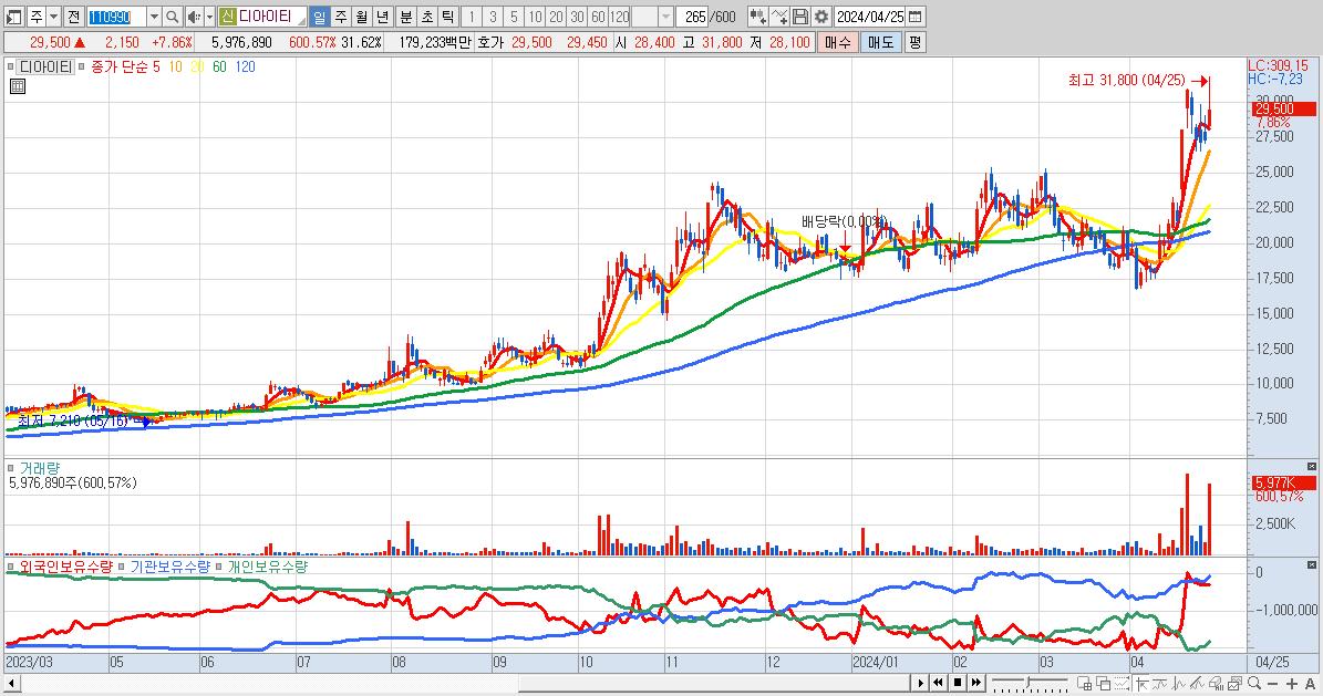 - 디아이티 (29,500원 ▲ 7.86% , 시총: 5,576억, 거래량: 5,976,890, 거래대금:1,792억)