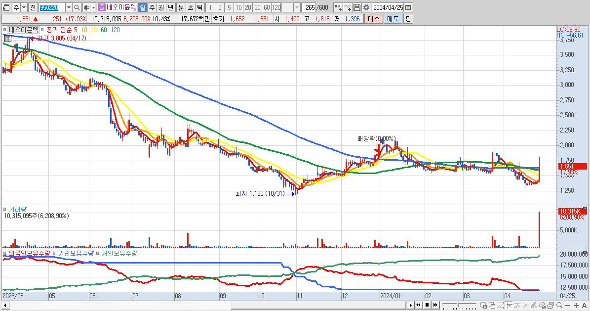 - 네오이뮨텍 (1,651원 ▲ 17.93% , 시총: 1,632억, 거래량: 10,315,095, 거래대금:177억)